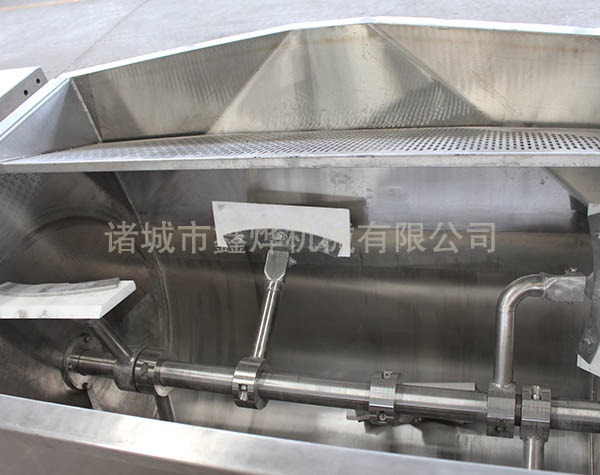 本機的U形鍋頂部抽真空,夾套采用蒸汽加熱,無段變速與蝸輪,減速機的組合傳動,增大了橫軸攪拌的力矩,采用食品級材質(zhì)材質(zhì)刮板的攪拌器,在物料的翻滾攪拌過程中,攪拌器與鍋體的充分接觸,確保了無攪拌死角。鍋體的開蓋,卸料,復(fù)位采用液壓,機械傳動控制,操作方便。真空炒制可降低炒制溫度,特別適應(yīng)于高粘度材料的炒制,避免了因過度受熱引起色澤及口味的變化,保持了物料原有的色香味。提高了炒制效率,并降低能耗,縮短了炒制時間。